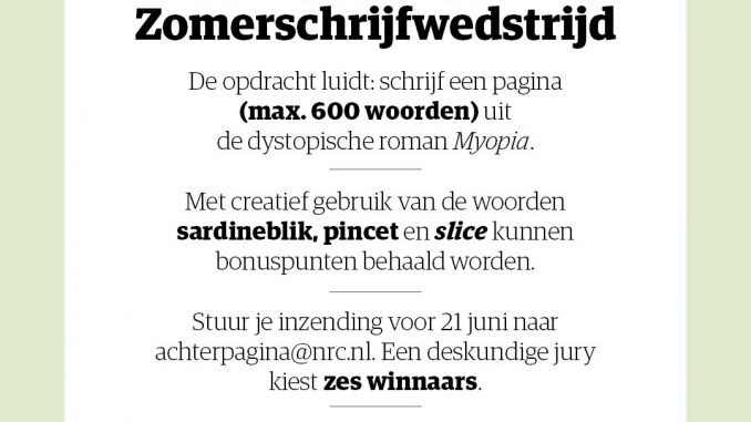 Betreed jij met je verhalen graag het territorium van de toekomst? Doe dan mee met de NRC Schrijfwedstrijd met als opdracht: schrijf een pagina uit de dystopische roman ‘Myopia’ (max. 600 woorden).